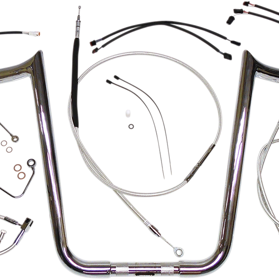 Caracteristicas: Complete kits with matching braided cables and brake lines Kits include throttle and idle cables of throttle-by-wire extensions, clutch cable or hydraulic clutch line, brake lines, copper crush washers, hardware, and any necessary switch wiring of turn signal extension All cable and brake lines feature Sterling Chromite II braid with highly polished chrome plated fittings All cables are a low-effort, high-efficiency design that meets or exceeds all OE specifications for fitment, construction and endurance Kits for dual disc models include an all brazed manifold that eliminates leaks, alignment problems and unattractive threaded connections Assembled in the U.S.A. Kits are based on using ape hanger style handlebars with 2†risers