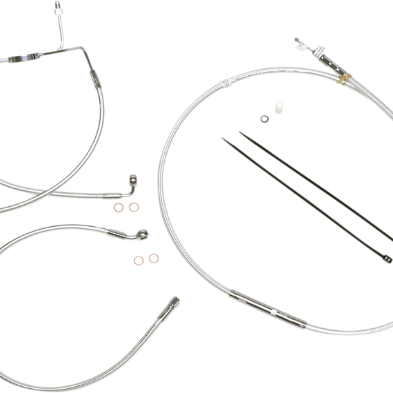 Caracteristicas: Complete kits with matching braided cables and brake lines Kits include throttle and idle cables of throttle-by-wire extensions, clutch cable or hydraulic clutch line, brake lines, copper crush washers, hardware, and any necessary switch wiring of turn signal extension All cable and brake lines feature Sterling Chromite II braid with highly polished chrome plated fittings All cables are a low-effort, high-efficiency design that meets or exceeds all OE specifications for fitment, construction and endurance Kits for dual disc models include an all brazed manifold that eliminates leaks, alignment problems and unattractive threaded connections Assembled in the U.S.A. Kits are based on using ape hanger style handlebars with 2†risers