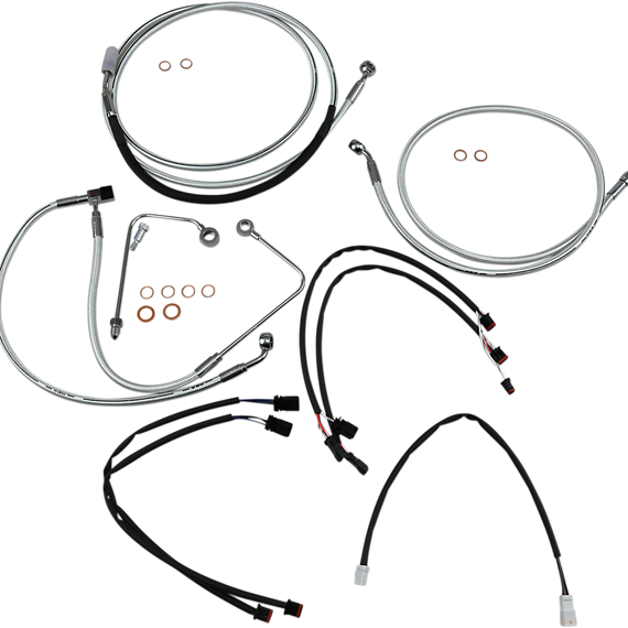 Caracteristicas: Complete kits with matching braided cables and brake lines Kits include throttle and idle cables of throttle-by-wire extensions, clutch cable or hydraulic clutch line, brake lines, copper crush washers, hardware, and any necessary switch wiring of turn signal extension All cable and brake lines feature Sterling Chromite II braid with highly polished chrome plated fittings All cables are a low-effort, high-efficiency design that meets or exceeds all OE specifications for fitment, construction and endurance Kits for dual disc models include an all brazed manifold that eliminates leaks, alignment problems and unattractive threaded connections Assembled in the U.S.A. Kits are based on using ape hanger style handlebars with 2†risers
