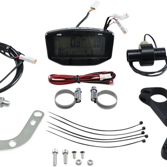 Caracteristicas: Speed/Distance/Voltage/Temperature/Clock Speedometer functions: current, average, maximum; selectable MPH/KPH Distance functions: trip, odometer, adjustable distance; selectable mile/kilometer Voltage function: voltage, maximum, minimum Temperature functions: engine temp, ambient temp, max engine temp, temp with LED alerts, model-specific sensors; selectable F/C scale Clock functions: hour meter, stop watch, ride time, accumulated ride time; selectable 12/24 hour display Maintenance: oil reminder, wrench reminder Power input: accepts any power input AC/DC, auto-switch to internal battery, permanent memory (data never lost) Waterproof design with high-intensity LCD white backlight display Optional top-mount gauge mount available separately - See Related Products