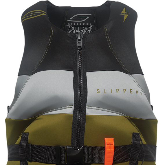 Caracteristicas: U.S. Coast Guard approved Type 3 PFD Two 1.5” adjustable belts with buckle closure Hidden back belts Heavy-duty zipper “D” ring for clip style lanyards Safety whistle