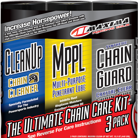 Caracteristicas: Kit includes: one 15.5-ounce aerosol can of Clean-Up, one 14.5-ounce aerosol can of MPPL, and one 14-ounce aerosol can of Synthetic Chain Guard Clean-Up, MPPL (Multi-Purpose Penetrant Lube) and Synthetic Chain Guard - a winning combination proven to increase horsepower and extend chain and sprocket life Clean-Up degreaser is excellent for chains and/or sprockets and easily washes out with water MPPL is a superior, all-purpose spray-on penetrating lubricant that provides a barrier against rust and corrosion; great for displacing moisture Synthetic Chain Guard allows lube to penetrate critical inner pins and rollers, lubricating and protecting them from friction, shock load and high temperatures; resists fling-off For off-road and street use
