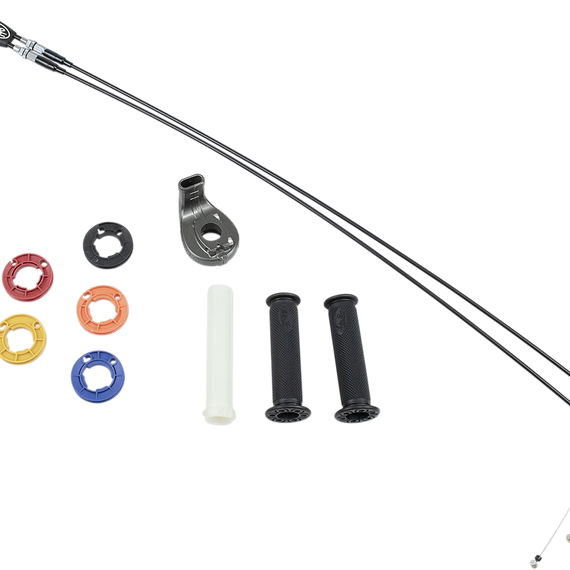 Caracteristicas: Ultra compact housing with snap-together elbows make it easy to install and change reels Requires less handlebar space for lever clearance and throttle position Smaller reels for slower throttle rate and larger reels for faster throttle rate Cable boot keeps dirt and dust out for reliable and smooth operation Lower section of cables use 5mm housing with PTFE liner for reduced friction, increased routing flexibility and lighter weight Upper section of cables use 6mm housing to provide solid support of adjusters Kit includes Rev 2 throttle assembly with throttle tube, black vinyl cables, standard interchangeable reels and cam reel