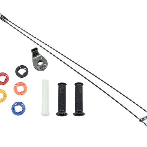 Caracteristicas: Ultra compact housing with snap-together elbows make it easy to install and change reels Requires less handlebar space for lever clearance and throttle position Smaller reels for slower throttle rate and larger reels for faster throttle rate Cable boot keeps dirt and dust out for reliable and smooth operation Lower section of cables use 5mm housing with PTFE liner for reduced friction, increased routing flexibility and lighter weight Upper section of cables use 6mm housing to provide solid support of adjusters Kit includes Rev 2 throttle assembly with throttle tube, black vinyl cables, standard interchangeable reels and cam reel