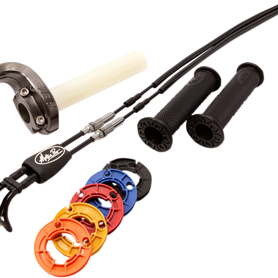 Caracteristicas: Ultra compact housing with snap-together elbows make it easy to install and change reels Requires less handlebar space for lever clearance and throttle position Smaller reels for slower throttle rate and larger reels for faster throttle rate Cable boot keeps dirt and dust out for reliable and smooth operation Lower section of cables use 5mm housing with PTFE liner for reduced friction, increased routing flexibility and lighter weight Upper section of cables use 6mm housing to provide solid support of adjusters Kit includes Rev 2 throttle assembly with throttle tube, black vinyl cables, standard interchangeable reels and cam reel