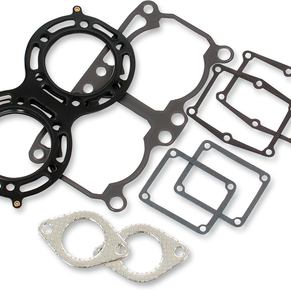 Caracteristicas: Top end gasket kits include correct base, head gasket and cylinder O-rings as well as other top end specific O-rings or seals needed for R&R of top end MLS head gaskets promote an even torque load across the gasket sealing surface, providing less bore distortion and better piston ring seal for more power 4-stroke head gaskets are made to perform on today’s highest-output 4-stroke naturally aspirated and boosted machines, utilizing a multi-layered steel design with the outer layers being embossed and coated with a Viton rubber coating; these head gaskets are designed to meet the demands of today's high-horsepower, high-cylinder-pressure engines EST (Extreme Sealing Technology) gasket kits include embossed stainless steel head, base and rocker gaskets covered with a proprietary rubber material Head gasket material allows heat to be drawn away from the combustion ring and dissipated evenly across the gasket surface to eliminate hot spots and gasket failure Made in the U.S.A.