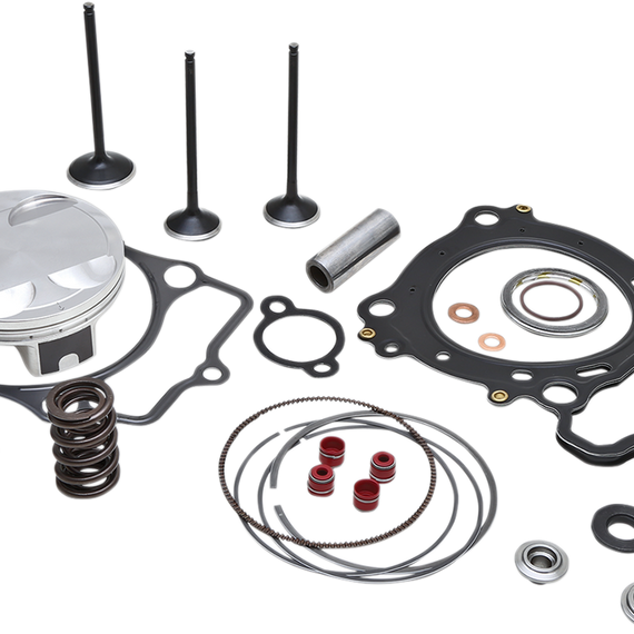 Caracteristicas: Kit includes all necessary parts for a complete top-end service/rebuild: pistons, piston rings, piston pins, gaskets, valves, and valve springs Pistons fully machined from 2618 aluminum alloy with a performance skirt coating Lightweight racing valve spring kit with titanium valve spring retainers, dual springs and H.T. steel base washers (springs are suitable for use with high-performance cams) All necessary gaskets, seals and O-rings included