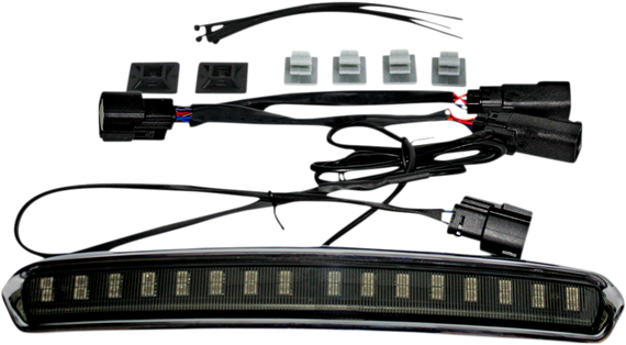 Caracteristicas: Add decorative visibility to the rear of your tour pak with the addition of our High Mount Tour Pak LED Light 32 50/50 LEDs for run and brake with 16 LEDs per side for red turn signal on most models Unit comes pre-taped to adhere to the top of the Harley-Davidson 2014-current King & Chopped style tour paks Includes plug and play wire harness for simple installation Fits models with stock LED King Tour-Pak®. Also Fits models with add-on '14-'20 King Tour-Pak® or Chopped Accessory Tour-Pak®. Typically models with Turn-Only rear turn signals function as Run/Turn only.