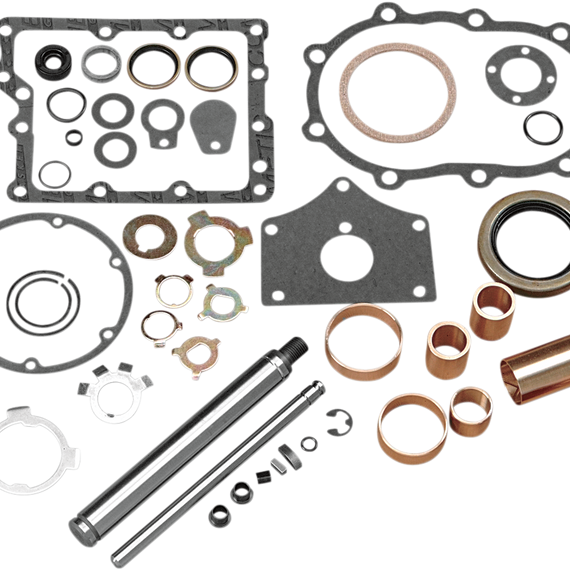 Caracteristicas: Feature JIMS transmission parts and gasket set Include standard size race, snap rings, clips, shift shaft, countershaft, seals and bushings; everything except bearings Made in the U.S.A.