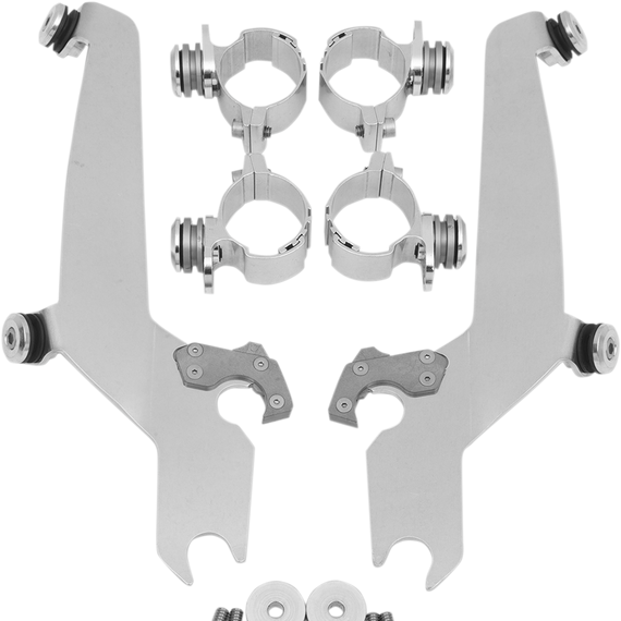 • Kits are a combination of CNC-machined aluminum plates and anchors, stainless steel hardware, gray polymer bushings and glass-filled nylon latches or "Night Shades" black version which, is a gradient black windshield with black E-coated stainless steel straps, fittings and hardware for a black-on-black sinister look