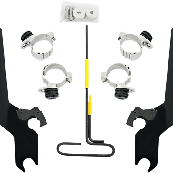 Caracteristicas: The revolutionary No-Tool Trigger-Lock mounting kits feature a detach system that allows you to quickly and easily remove or swap out your Sportshield without the use of any tools A pair of latches lock the windshield down until the spring loaded "trigger locks" are intentionally disengaged, allowing the rider to remove the windshield Kits are a combination of CNC-machined aluminum plates and anchors, stainless steel hardware, gray polymer bushings and glass-filled nylon latches or "Night Shades" black version which, is a gradient black windshield with black E-coated stainless steel straps, fittings and hardware for a black-on-black sinister look Kits are custom-fit to each style of bike for no-hassle installation