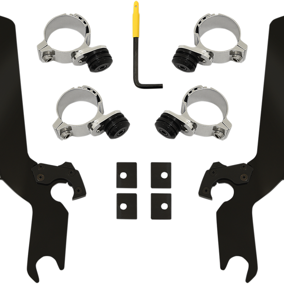 Caracteristicas: The revolutionary No-Tool Trigger-Lock mounting kits feature a detach system that allows you to quickly and easily remove or swap out your Sportshield without the use of any tools A pair of latches lock the windshield down until the spring loaded "trigger locks" are intentionally disengaged, allowing the rider to remove the windshield Kits are a combination of CNC-machined aluminum plates and anchors, stainless steel hardware, gray polymer bushings and glass-filled nylon latches or "Night Shades" black version which, is a gradient black windshield with black E-coated stainless steel straps, fittings and hardware for a black-on-black sinister look Kits are custom-fit to each style of bike for no-hassle installation