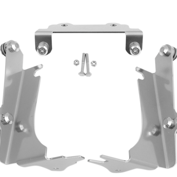 • Kits are a combination of CNC-machined aluminum plates and anchors, stainless steel hardware, gray polymer bushings and glass-filled nylon latches or "Night Shades" black version which, is a gradient black windshield with black E-coated stainless steel straps, fittings and hardware for a black-on-black sinister look