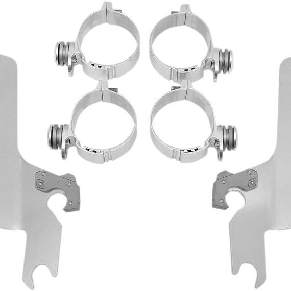 • Kits are a combination of CNC-machined aluminum plates and anchors, stainless steel hardware, gray polymer bushings and glass-filled nylon latches or "Night Shades" black version which, is a gradient black windshield with black E-coated stainless steel straps, fittings and hardware for a black-on-black sinister look