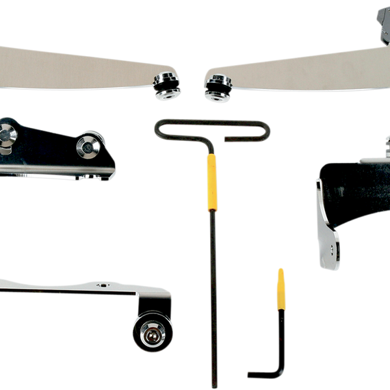 Caracteristicas: The revolutionary No-Tool Trigger-Lock mounting kits feature a detach system that allows you to quickly and easily remove or swap out your Sportshield without the use of any tools A pair of latches lock the windshield down until the spring loaded "trigger locks" are intentionally disengaged, allowing the rider to remove the windshield Kits are a combination of CNC-machined aluminum plates and anchors, stainless steel hardware, gray polymer bushings and glass-filled nylon latches or "Night Shades" black version which, is a gradient black windshield with black E-coated stainless steel straps, fittings and hardware for a black-on-black sinister look Kits are custom-fit to each style of bike for no-hassle installation