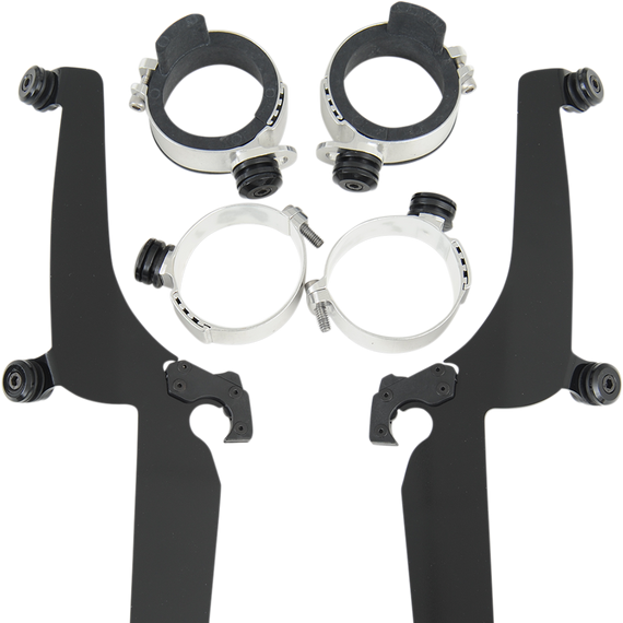 • Kits are a combination of CNC-machined aluminum plates and anchors, stainless steel hardware, gray polymer bushings and glass-filled nylon latches or "Night Shades" black version which, is a gradient black windshield with black E-coated stainless steel straps, fittings and hardware for a black-on-black sinister look