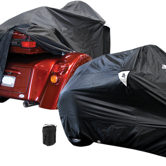 Caracteristicas: Made of medium-weight Tri-Max® polyester, this is the only trike cover guaranteed to be 100% waterproof All seams are electronically heat sealed and have silver heat-resistant lower panels Exclusive Perma-Venting® system prevents condensation buildup by allowing constant air circulation 50" rear zipper gives access to trunk without cover removal Snug-fitting, elasticized bottom has 1" grommets in center and at front wheel Packed in included compression bag for the ultimate in compact storage