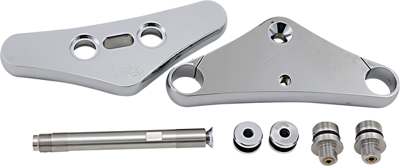 Caracteristicas: CNC-machined from aircraft-quality billet aluminum Includes fork tube plugs that allow for a clean, finished look on the top of the triple tree Triple trees are pre-drilled to mount the Pro-One Hide Away internal fork stop kits Includes handlebar dampers with chrome billet caps, a fork stem, and all the necessary mounting hardware Accepts 41 mm fork tubes Raked triple trees change handling characteristics of motorcycle. Steering geometry must be calculated to determine which degree of rake is most suited for application. Trees with more than 3° of rake should not be used in stock frame applications.