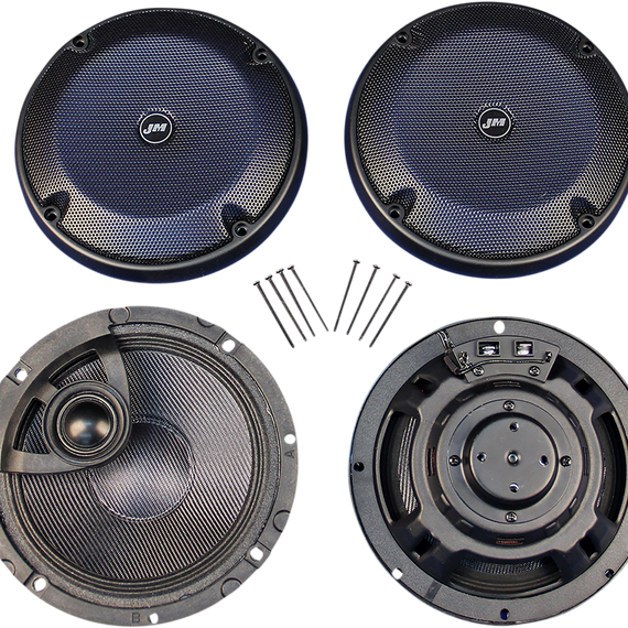 Caracteristicas: Replacements for the stock 6.5" Harley rear trunk-pod speakers Lightweight waterproof one-piece woven-fiber driver cone with super-rigid metal basket design High-density lite-weight Neodymium magnet structure, specially coated to maintain flux-strength integrity even at extreme operating temperatures Integral high-output PEI dome tweeter with custom J&M grills included Mounting hole pattern and spade electrical connections are exactly the same as the factory specification Plug-and-play no-modification solution complete with easy to follow installation instructions