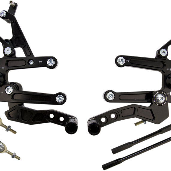 Caracteristicas: Race-inspired design All rearsets feature high-grade hardware, folding shift/brake pegs and standard or reverse shift pattern options Footpeg plate has a small window that shows peg adjustment value and conceals all mounting holes not in use Anodized black finish