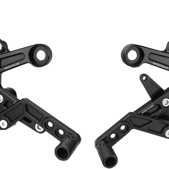 Caracteristicas: Race-inspired design All rearsets feature high-grade hardware, folding shift/brake pegs and standard or reverse shift pattern options Footpeg plate has a small window that shows peg adjustment value and conceals all mounting holes not in use Anodized black finish