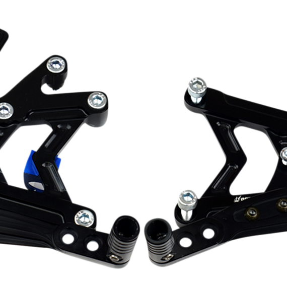 Caracteristicas: Race-inspired design All rearsets feature high-grade hardware, folding shift/brake pegs and standard or reverse shift pattern options Footpeg plate has a small window that shows peg adjustment value and conceals all mounting holes not in use Anodized black finish