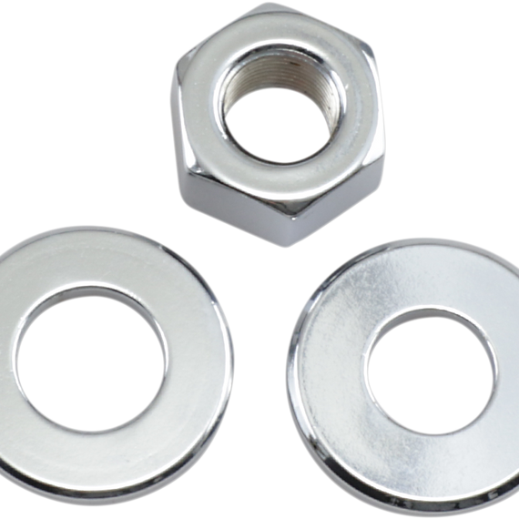 Caracteristicas: Kit consists of two heavy-duty machined steel flat washers, one heavy-duty lock washer and one hex nut Washers prevent distortion of square swingarms All pieces are chrome-plated Made in the U.S.A.