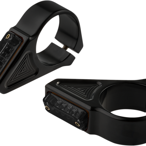 Caracteristicas: CNC machined from solid blocks of T6-6061 billet aluminum Pitch bolt mounting design for a clean look Can be mounted either inward or outward of the fork tubes Super bright amber LED lights; 1-1/2" wide, 1/2" tall Lights are set a 25 degree angle for standard HD forks Made in the USA
