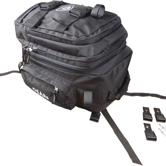 Caracteristicas: Features a versatile four-point cam buckle hold-down system that allows installation either lengthwise or crosswise and ensuring contents are secure on even the harshest trails This system, along with the convenient handle, makes it easy to remove and take with you at the end of the day Expandable main pocket, 1260d waterproof fabric and covered zippers makes the bag virtually waterproof; extra-large zippers for easy access Top and side pockets for storing smaller, yet essential items Anti-slip and anti-scratch pocket provided at the bottom of the bag Two webbing straps on top to secure larger items Shovel blade pouch on top for quick access and two side hook-and-loop-secured loops to secure the shovel rod Bag accommodates 9”wide shovel Installs easily on both mountain and trail sleds Size: 16.5”L x 10”W x 9.5” H (non-expanded)/12.5”H (expanded) Available in black