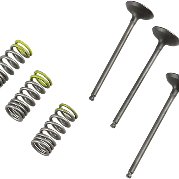 Caracteristicas: Replaces the OEM valves and valve springs Steel, nitrided valves for increased durability and less wear under extreme conditions Stronger valve springs deal with the extra weight of the steel valves Springs are made from premium chrome vanadium steel for higher performance and durability at high rpm Kit contains a set of steel intake or exhaust valves plus a set of specially designed valve springs; can be installed using the OEM retainers, bases and valve seals