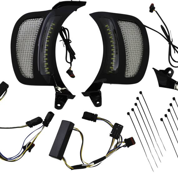 Caracteristicas: Bolt on to the left and right sides of the factory headlamp Provides LED white running lights and amber turn signals Feature a stainless steel mesh to fill the void between the fairing and headlamp