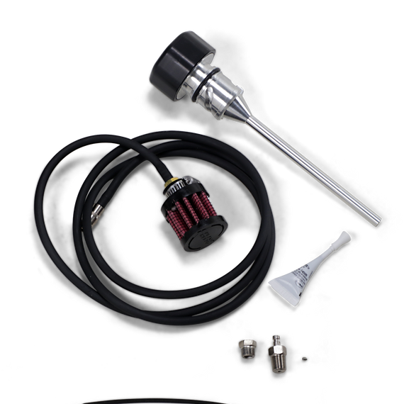 Caracteristicas: Screws into the factory oil fill spout as a stock replacement part on M-Eight baggers This breathing dipstick removes unwanted build-up of blow by, which is found in engines with excessive leakdown through the rings/cylinders which is a common issue with large displacement big bore engines Test results show a decrease in engine sump oil levels Dipstick vents excessive pressure from the oil tank through a breather system consisting of a filter element and umbrella valve Choose from two venting style options when installing the dipstick Option 1 is to use the 1/8 NPT breather vent fitting with internal porous filter element (this option gives a clean look; however it can produce an oil misting/residue out of the element on engines with excessive leakdown/blow by) Option 2, is to use quick-disconnect coupler fitting with rubber hose and filter element (this option will run any excessive oil misting/residue through the line and into the filter element, but does requires disconnecting the fitting in order to check the oil) For option 2, we recommend routing the line up the frame rail, up under the seat/abs area then back down along the right side frame rail and the filter element can fit cleanly between the engine/trans matting area on the inside of the lower right frame rail There are two ways to read the oil level with this dipstick, with the bike on the jiffy stand (FHS) or the bike upright and level (FHU) If reading the dipstick with the bike on the jiffy stand you will take your reading from the dimples labeled FHS (Full Hot Stand) When reading the dipstick with the bike upright and level you will take the reading from the dimples labeled FHU (Full Hot Upright) Made in the U.S.A. The oil pick-up port is on the right side of the engine. Letting the bike idle or warm up on the kickstand will naturally fill the engine case and skew the oil level in the tank.