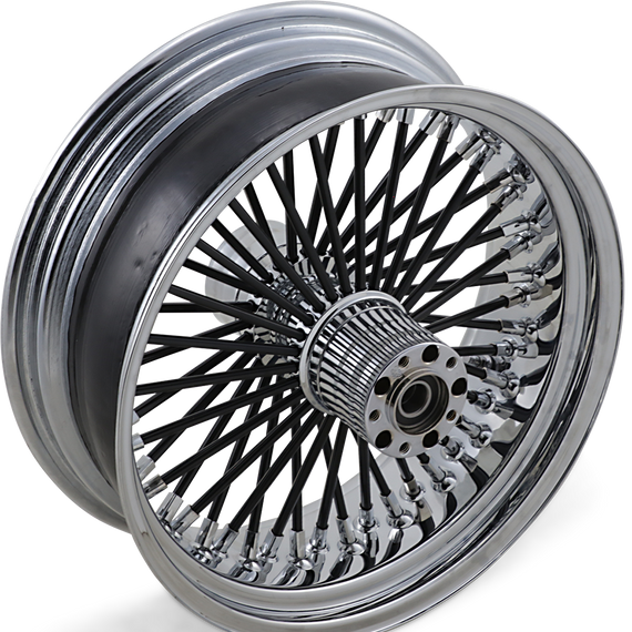 Caracteristicas: Chrome billet aluminum hubs with 3/8" stainless steel black spokes and chrome cold rolled steel nipples Wheels are sealed for most applications so that tubeless tires can be used (except 21" x 2.15" wheels) Wheels come completely assembled and are trued to less than .005" runout Radially-laced design gives the wheels a very unique look Made in the U.S.A. by RideWright Wheels Chrome conventional-style steel rim It is the installer's responsibility to determine the required changes.