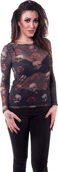 Women's Floating Skulls Long-Sleeve Sheer Shirt - Black - Medium
