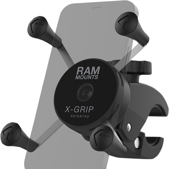 Caracteristicas: Low-profile phone mount clamps to your handlebar with the turn of a single knob Spring-loaded 'X' design for standard size phones with rubber caps sports great holding power without hiding your phone; includes optional device tether for peace of mind during rugged use Small version of the RAM® Tough-Claw™ base is designed to quickly clamp to round, square, and odd-shaped rails and bars ranging from 5/8" to 1-1/2" in diameter; rubber pads provide stable gripping and protection of mounting surface Made of high-strength composite and stainless steel hardware for durability and reliability in the most demanding environments Backed by a lifetime warranty