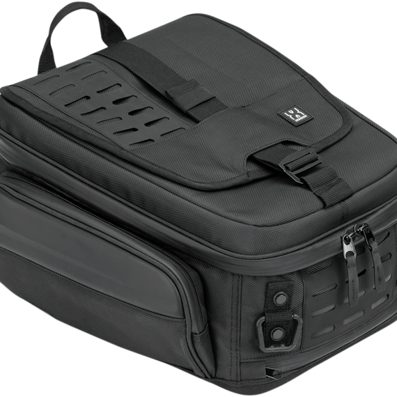 Caracteristicas: Contoured and thermoformed bottom for strength, structure, and secure mounting Integrated fixed shoulder strap stows away discreetly when not in use Shoulder strap and wide grab handle offer easy transport off the bike Side-mounted quick stash pockets for keeping smaller items organized Built-in coat flap with adjustable G-Hook for quick and easy external storage Thermoformed construction and components for strength, security and shape retention Reflective accents for enhanced visibility UV-rated and weather-resistant 1680 denier textile material, with included rain cover Glove-friendly, weather-resistant zippers Premium lined interior with multiple pockets and compartments Heavy-duty ergonomic carrying handle