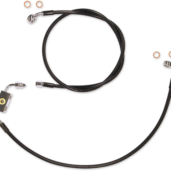 Caracteristicas: Inner PTFE tubing braided with XR stainless steel reinforcement embedded in a tough nylon outer jacket offers exceptional protection for paint or chrome All brazed manifold construction eliminates leaks, alignment problems, and unattractive threaded connections for a sleek appearance Designed to be compatible with Harley-Davidson® ABS requirements for stock and alternate length brake lines Manufactured with an enhanced construction for extreme braking response and durability 3AN connections for easy installations Made in the U.S.A.