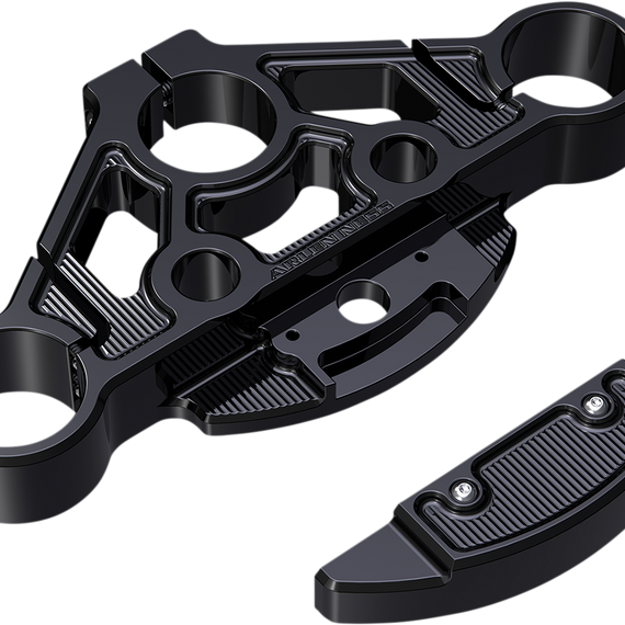 Caracteristicas: CNC machined 6061 billet top triple tree for '15-up Road Glide Models Lightweight design features method styling and cut through windows Direct bolt-on fitment accepts all factory front end components Compliments Ness Method riser kits & ignition kits for Road Glides for a full custom front end look with factory function Black anodized finish