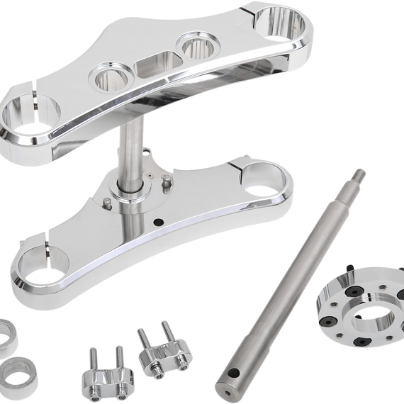 Caracteristicas: Manufactured from billet aluminum Include triple trees, rotor spacer, fender spacers, axle spacers, axle and instructions Made in the U.S.A. Raked triple trees change the handling characteristics of the motorcycle. Steering geometry must be calculated to determine which degree of rake is most suited for your application. Trees with more than 3° of rake should not be used in stock frame applications.